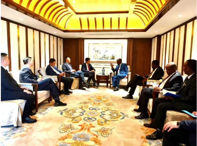 肯尼亚商务部长Hon Lee Kinyanjui(右一)在北京钓鱼台国宾馆与美中商会孙文铁会长(左二)、周立新副会长(左一)及代表团进行深入会谈,探讨两国经贸合作的广阔前景。Hon Lee Kinyanjui向孙文铁会长一行详细介绍肯尼亚的投资政策,展示肯尼亚对国际投资者的开放态度,非洲大陆拥有14.6亿人口的巨大市场,发展潜力无限。